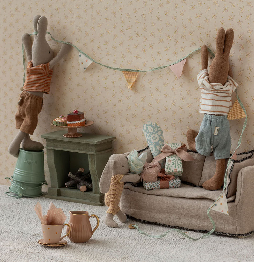 Dieses Set mit drei köstlichen Kuchen auf einem wunderschön dekorierten rosa Kuchenständer ist ein echtes Must-have. Die Kuchen werden sorgfältig von Hand dekoriert. Das Set ist in Minigrößen für die Teddy-Familie und in den Größen 1 und 2 für Hase und Kaninchen erhältlich, aber auch die Maileg-Mäuse lieben sie. Das Ganze wird in einer schönen Schachtel geliefert. Die Schachtel dieses Sets weist an mehreren Seiten leichte Beschädigungen auf.