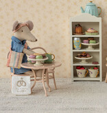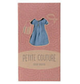 Hip, stylish clothing set for mother mouse by Maileg. The set consists of a denim dress, a bag and a headband. The clothing set is beautifully packaged in a box with 'Petite Couture' on it.
